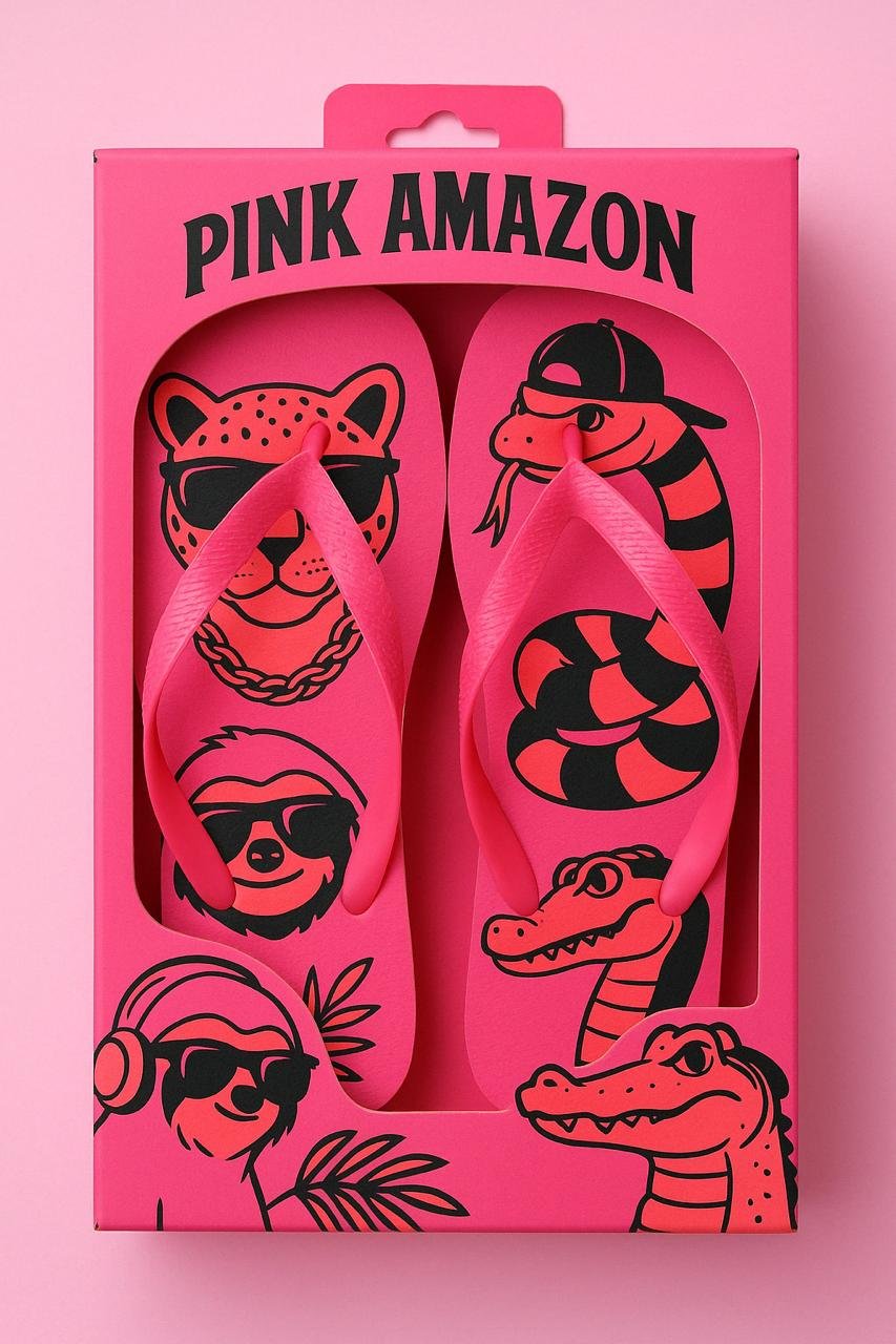 A Pink Amazon é mais que uma marca de sandálias. É um statement. Nascida no coração da Amazônia e inspirada pela força vibrante da floresta, trazemos ao mundo um novo conceito de moda tropical: ousadia, conforto e identidade. Cada modelo é um grito de liberdade com alma brasileira e atitude internacional. Com estampas marcantes, personagens da selva urbana (como onças, araras e jacarés estilizados usando óculos e acessórios), e o rosa pink vibrante como assinatura visual, criamos um movimento: um lifestyle selvagem, divertido e inconfundível.